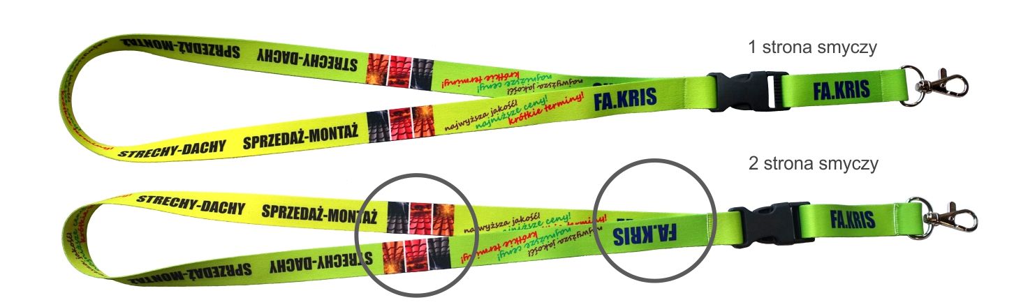 Smycze te w porównaniu do smyczy standardowych drukowane są w taki sposób aby pierwsza  strona pokrywała się z drugą.